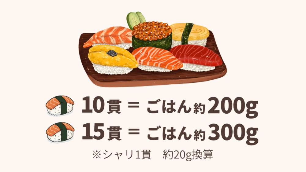 10貫:ごはん約200g 15貫:ごはん約300g 20貫:ごはん約400g
