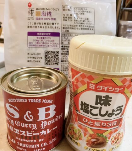 今回のポイントとして、調味料は市販のカレールウではなく、写真のカレー粉を使用します。